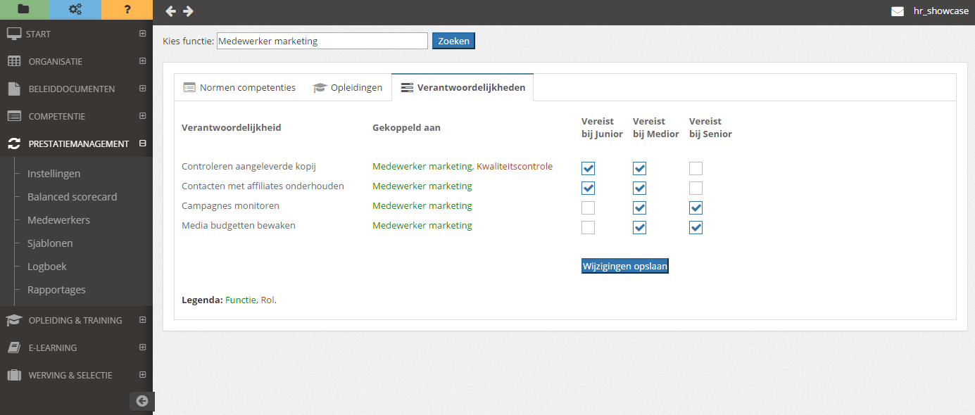 Door het menu Prestatiemanagement -> Instellingen te selecteren en vervolges een functie te kiezen, kunnen eenvoudig de normen voor de competenties worden ingevuld door de waarden 0 t/m 5 te gebruiken. 0 Betekent niet van toepassing, 1 betekent Beperkt, etc. Door op de tabjes Opleidingen en Verantwoordelijkheden te klikken, kan per opleiding en verantwoordelijkheid worden aangegeven voor welke niveaus ze van toepassing zijn.